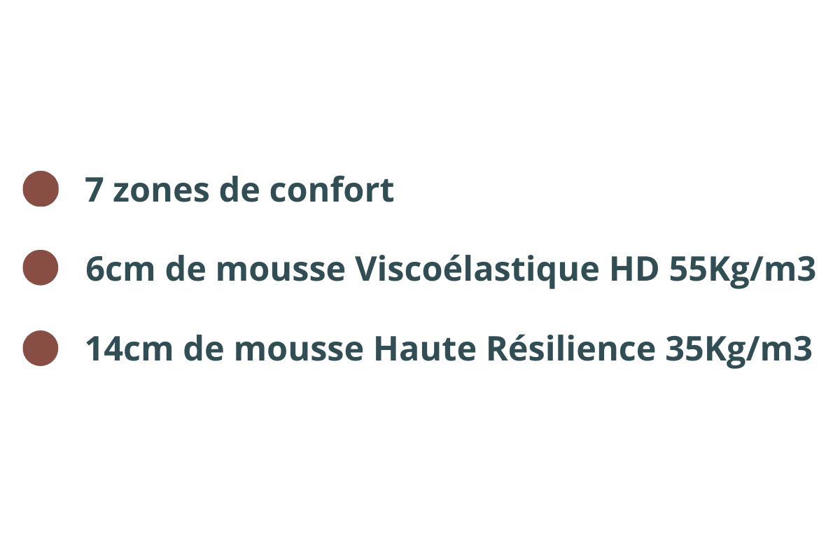 | Composition (du haut vers le bas) | - 6cm de mousse viscoélastique Sanimatex HQ 55kg/m3 - 14cm de mousse Haute Résilience Sanimatex HD35kg/m3 - noyau profilé en 7 zones de confort - coutil amovible et lavable 4cm |